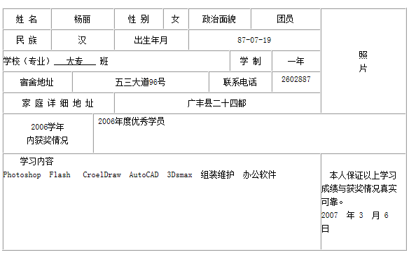 姓名裴雙福性別男政治面貌團員照片民族漢出生年月90-12-12學校(專業)廣告設計班學制一年宿舍地址五三大道96號聯系電話3955205家庭詳細地址萬年縣裴梅鎮2006學年內獲獎情況2006年度優秀班學員榮獲Access數據庫考試......
