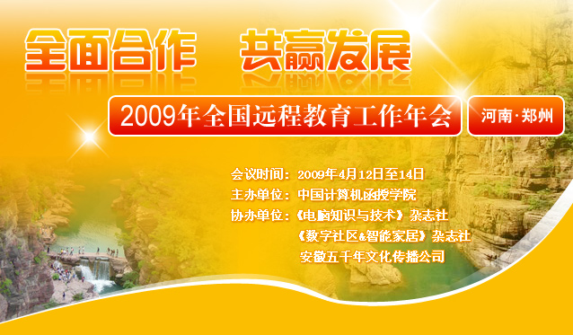 尊敬的各位教學站校長:  中國計算機函授學院2009年全國遠程教育工作年會定于2009年4月12日至14日在鄭州嵩山飯店召開,現誠摯地邀請您參加此次會議?! ∪珖h程教育工作年會是我院發展遠程教育實施的一項重大舉措,統一思想、凝聚力量、促進工作、共謀發展,是年度盛會的基本任務和目標。  本次會議由中國計算機函授學院主辦,《電腦知識與技術》雜志社、《數字社區&智能家居》雜志社、安徽五千年文化傳播公司協辦。本次年會主題為:全面合作 共贏發展。會議期間將進行2008年工作總結和2009年工作展望,并作大會主題演講,以及開展辦學經驗交流、專題研討和表彰先進等活動。  鑒于此次會議邀請的教學站數量較多而參會人數有限,故請各教學站只安排一到兩位最主要的負責人參會,敬請理解!  我們期待著您的到來。讓我們攜手為中國IT職業教育的發展貢獻力量。 中國計算機函授學院 遠程教育學院2009年3月