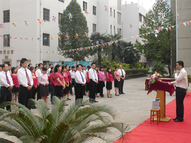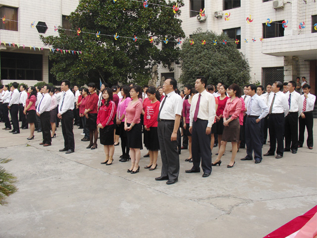 在綠蔭成景的花壇正前方,學院領導和員工站列成整齊的方陣,面向國旗齊唱國歌,共相慶祝偉大祖國60華誕。