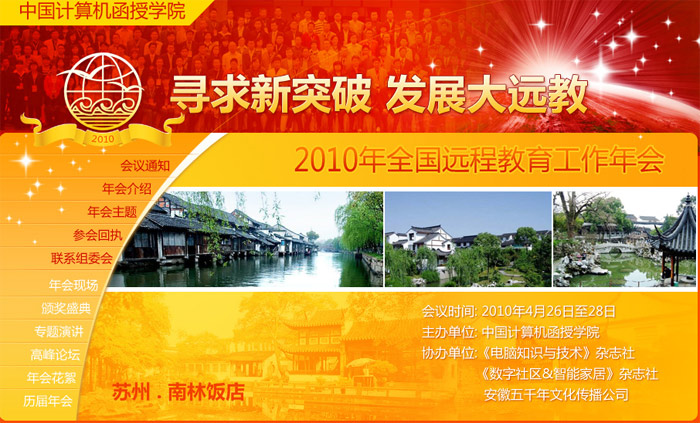 中國計算機函授學院2010年全國遠程教育工作年會定于2010年4月26日至28日在蘇州南林飯店召開,現誠摯地邀請您參加此次會議。