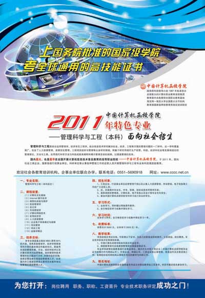 特色專業: 《管理科學與工程專業》涵蓋了 MBA課程的精華部分,為管理干部和市場經營主管提供全面學習的機會,完成學業后,可勝任管理、市場營銷、會計、電子商務、人力資源等崗位的工作。