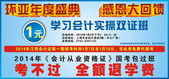 二、下午1:00--5:00舉辦以《環亞年度盛典  感恩大回饋活動》為主題,現場報名:只需1元就可以學習會計考證、會計真賬、助理會計師等課程,地址:上饒市金鈺大酒店3樓(中心廣場)  ,咨詢熱線:0793-8307133,2014年江西會計證第一期報考時間1月7日至1月18日,來環亞免費為您代報考