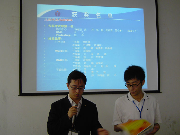 各科考試取第一名: 基礎考試: 陳曉麗 姚 丹 楊 楊 張麗萍 王小琳 鄭琦玉子 CAD: 余 孔 Photoshop: 姚 丹 技能比賽: 打字比賽: 一等獎: 鐘凱強 二等獎: 於修琪 陳曉麗 三等獎: 姜 鵬 高倩倩 項振綱 Word比賽: 一等獎: 項振綱 二等獎: 劉 溪 姜 鵬 三等獎: 姚 丹 於修琪 CAD比賽: 一等獎: 項振綱 二等獎: 鄧 鵬 周德武 三等獎: 陳裕芳 徐 超 楊 鋒 平面比賽: 一等獎: 裴 芬 二等獎: 周 雲 王 迪 三等獎: 童 婷 陳海崖 姚 丹