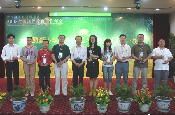 開幕式上,遠(yuǎn)程教育學(xué)院副院長張保斌、教學(xué)管理處主任錢飛衛(wèi)向大會作了工作報告;學(xué)院圖書出版部張衛(wèi)平主任還就圖書發(fā)行情況向大會作了工作匯報。 錢洲勝院長為2007年度“十佳”教學(xué)站獲獎代表頒獎并合影