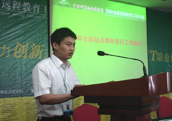 學(xué)院技術(shù)總監(jiān)楊輝軍博士從在學(xué)校信息化管理方面發(fā)表了主題講話。楊博士以中國計算機(jī)函授學(xué)院學(xué)生綜合管理系統(tǒng)軟件為依據(jù),系統(tǒng)全面地介紹了信息化技術(shù)在學(xué)籍管理、教務(wù)管理、財務(wù)管理等方面的應(yīng)用。最后楊博士還向與會代表介紹了《電腦知識與技術(shù)》雜志的相關(guān)情況,尋求資源共享,實(shí)現(xiàn)共贏發(fā)展。 遠(yuǎn)程教育學(xué)院副院長張保斌向大會作工作報告 教學(xué)管理處主任錢飛衛(wèi)向大會作工作報告 學(xué)院圖書出版部張衛(wèi)平主任向大會作工作報告