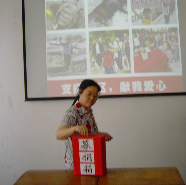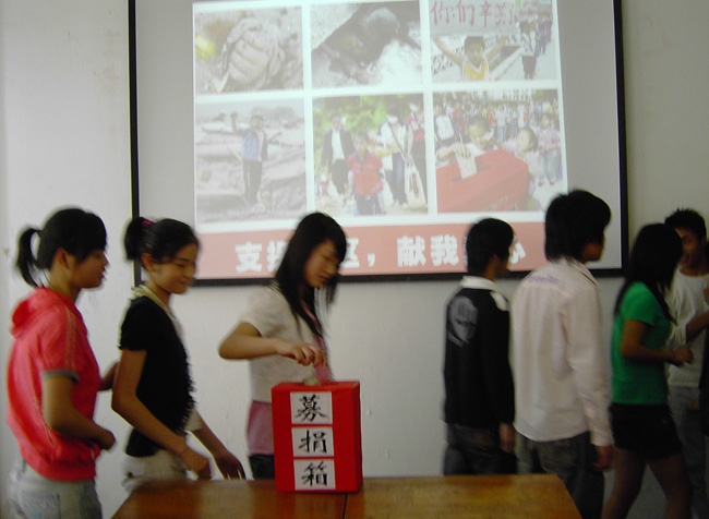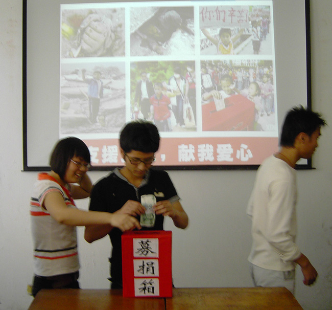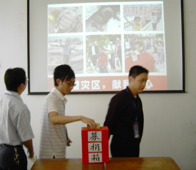 2008年5月12日,汶川地震震驚全國,這場7.8級的地震給災區的同胞造成了巨大的創傷和痛苦。大量民房頃刻倒塌,眾多居民被埋廢墟,許多幸存者無家可歸,很多人在暴雨中瑟瑟發抖,數十萬人在忍受失去親人的痛苦……支援災區,獻我愛心!上饒環亞電腦學校于08年5月20日舉行了心系災區援助汶川捐款儀式。學校全體師生伸出援手,獻出愛心,踴躍捐款,為災區人民盡我們的一點微薄之力。 第一教室響起了韋唯的《愛的奉獻》時,同學們紛紛拿出自己平時節省下來的零用錢為災區獻上一份微薄之力,以實際行動為抗災做出貢獻。 在此之前,上饒環亞電腦學校一些老師、同學在上饒市各獻血站、捐助點,獻了血捐了款。據悉,在本地與外地實習的學生也踴躍向災區捐了款。 我們希望用我們的愛心筑起抵抗災難的長城,用我們的溫暖撫慰災區人民的創傷,幫助災區人民渡過難關,重建家園!上饒環亞電腦學校全體師生祝愿災區的人民早日渡過難關! 學校全體師生踴躍捐款 學校全體師生踴躍捐款 學校全體師生踴躍捐款 學生省下零用錢向災區人民表達愛心 學生省下零用錢向災區人民表達愛心 學生省下零用錢向災區人民表達愛心